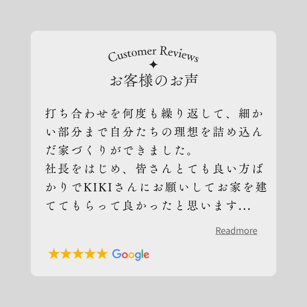 EVENT 完成見学会のお知らせ 日時不定期開催 家づくり無料相談会 日時ご希望の日時でご相談ください。場所三重県亀山市 リフォーム・建替え相談会 日時ご希望の日時でご相談ください。場所当社/オンライン対応可/出張相談可 平屋の家づくり相談会 日時ご希望の日時をご相談ください場所亀山市 more KIKIの家づくり12の特徴 家を『建てる』ということ。家を『育てる』ということ。双方の視点が上手くバランスする家。それこそが私たちがお伝えしたい、また、一緒になって築きたい家です。 more PHOTOGALLERY 施主のこだわりを妥協なく形にした平屋 | 和室・LDK・造作家具が調和する家 自分らしく、自由に住まう。35坪の平屋に詰め込んだ、ふたりの「好き」と快適 40坪の平屋で叶える、ちょっと贅沢な夫婦の暮らし 23坪のふたり暮らしの家 広々テラスと居心地の良い空間デザイン | 人が集まる癒しの場所HYGGELIG 家事楽動線で快適な暮らし | 家族の思い出を紡ぐ家 愛犬もHAPPY!オーク材と大谷石で作る家 温泉のある平屋 漢のガレージハウス 家事動線と回遊動線を持つ平屋 エステルームとカバードポーチを持つ家 山小屋モダンの家 more Living Motif KIKIの想い 私たちは、家の中にこそ大切にするべき時間があるものと考えています。暮らしの中で四季を感じ、ご家族やご友人と幸せな時間を共有できる『場』をつくり、長い年月を経てもなお受け継がれる家であること。 私たちの想い