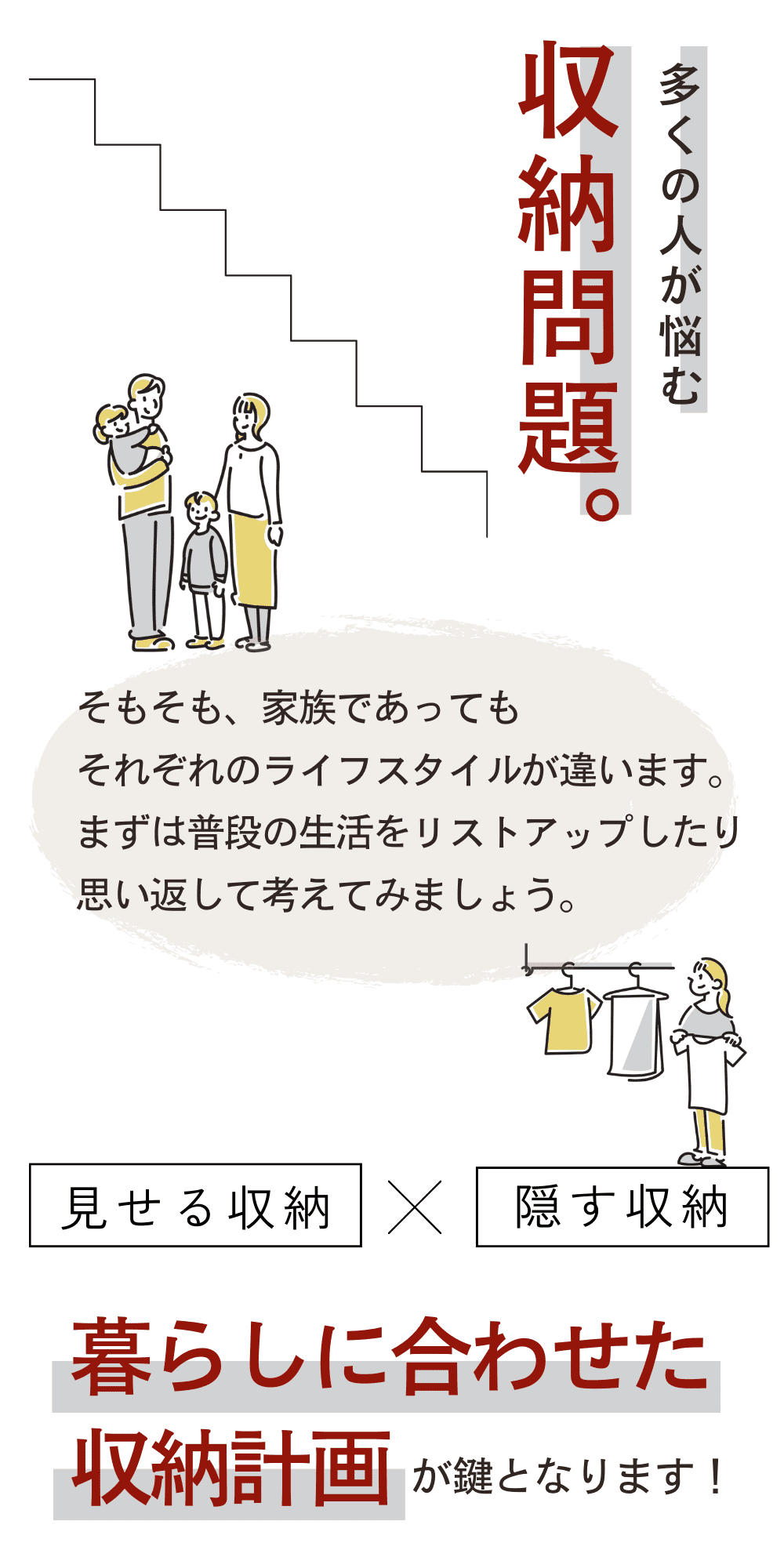 ご自身の普段の生活を今一度思い出して、 適切な場所に収納スペースを確保していきましょう。 |