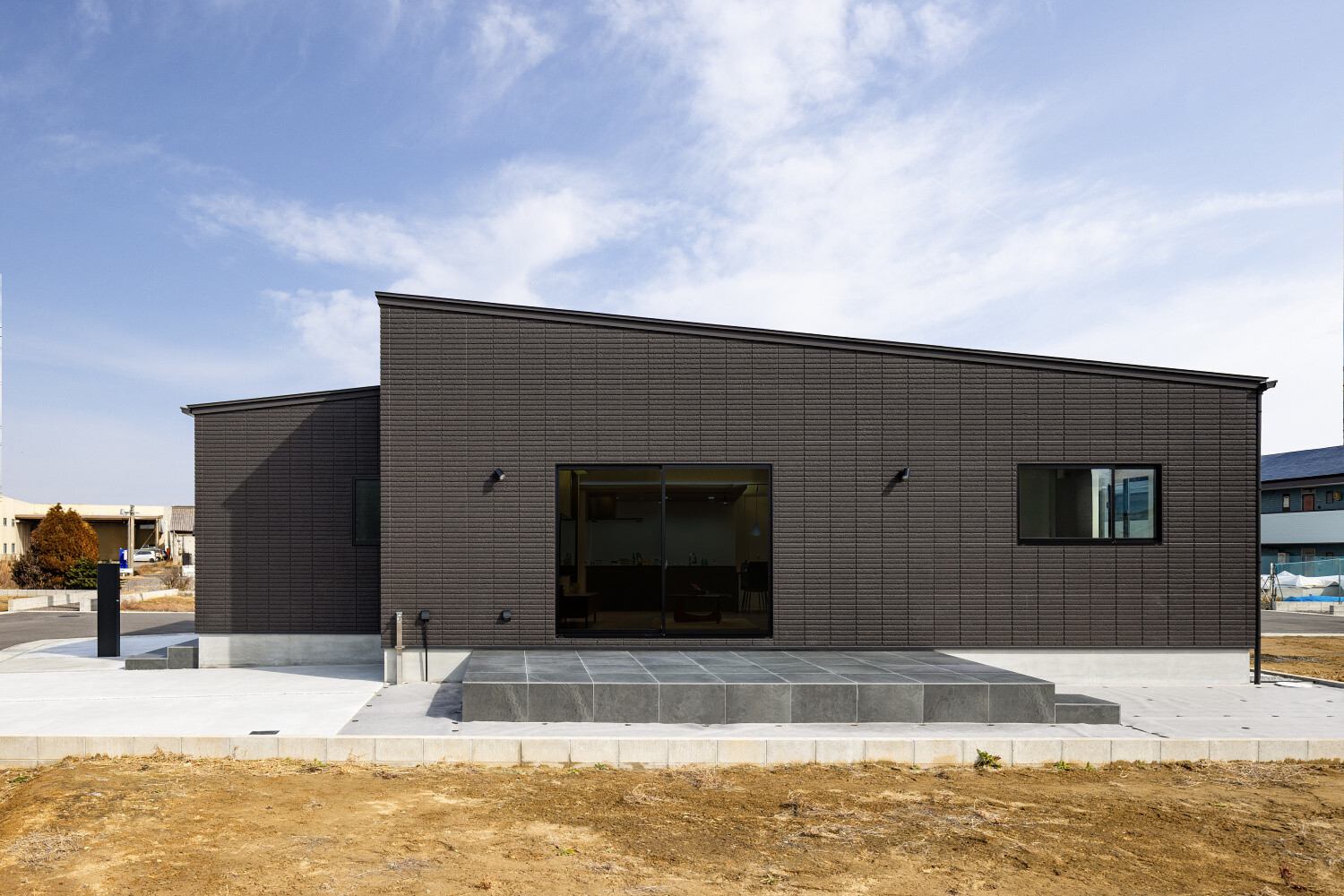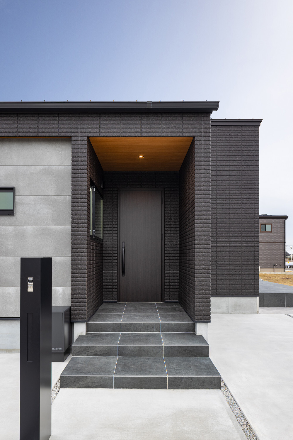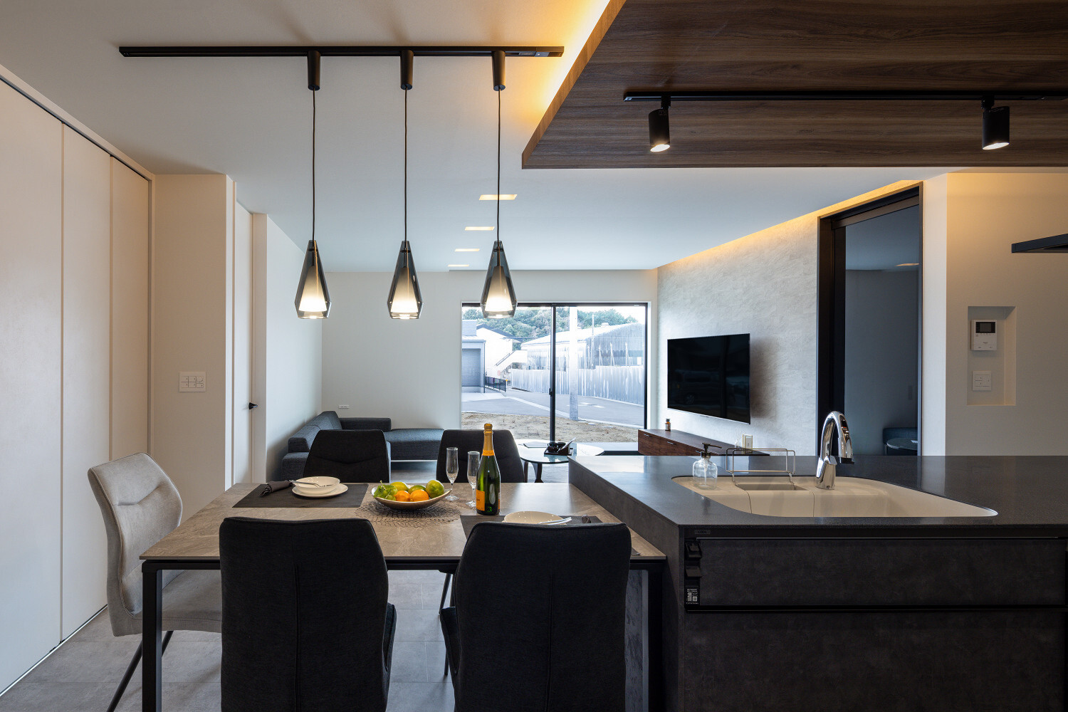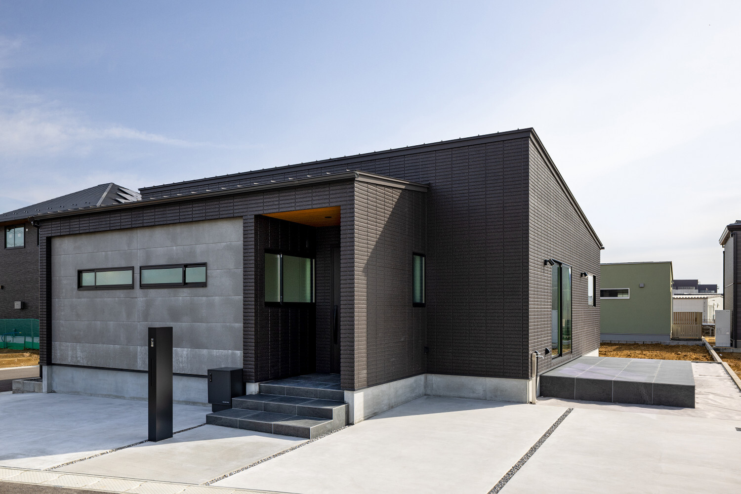 ホーム フォトギャラリー スタイル | Style すべて | ALL 光の設計が美しいグレイ×木目の32.5坪平屋 光の設計が美しいグレイ×木目の32.5坪平屋 スタイル | Style|すべて | ALL 開発団地角地、約70坪強の広い敷地に建つ子育て世代のお施主様のための32.5坪の平屋。 外壁は標準仕様のALCパワーボードを基本とし、アクセントにKMEWのSOLIDOを使用しております。画像のみを表示全 19 枚中 1 枚目を表示Next ≫ 玄関扉は幾分奥まったところに配し、降雨の折の帰宅時にも慌てて鍵を開ける必要がないように、また外から玄関扉が目立ち過ぎないように計画させて頂きました。画像のみを表示全 19 枚中 2 枚目を表示≪ Prev|Next ≫ 家の南側は大きなタイルテラスを設置させて頂きました。 タイルテラスは管理も楽ですし、劣化もそれほど心配しなくて良いのですが、夏は熱を持ってしまいますのでタイルテラス近くには立水栓の設置をされると良いと思います。画像のみを表示全 19 枚中 3 枚目を表示≪ Prev|Next ≫ 門柱はごくシンプルなモノとし、玄関タイルは外壁に合わせるような色味の600角となっております。 また、無機的な外壁に対し軒天の木目をアクセントとして配しました。画像のみを表示全 19 枚中 4 枚目を表示≪ Prev|Next ≫ リビング扉は薄くグレイのスモークが掛かった半透けの引き戸を天井一杯になるように計画。 スッキリ見え、また視覚的に天井を高く感じて頂けるようになっておるのではないでしょうか?画像のみを表示全 19 枚中 5 枚目を表示≪ Prev|Next ≫ 玄関の照明は天井の中心に配するのではなく、壁側に寄せまたそこにエコカラットを設置し、その凹凸に光が当ててその反射光で室内を照らすような形の計画となっております。画像のみを表示全 19 枚中 6 枚目を表示≪ Prev|Next ≫ 玄関ホールだけでなく、何にどう光を当てて、どのくらいの明るさにするかに依って、光源の位置も種類も数も色々考えていくと面白いと思います。 部屋の中心でひとつの光源で部屋を隅から隅まで明るくする照明でなくても良いように思います。画像のみを表示全 19 枚中 7 枚目を表示≪ Prev|Next ≫ リビング側からの扉の写真です。 良い感じで玄関ホール側の光が見えていると思います。 ちなみに玄関ホールのダウンライト3灯はセンサー付きとなっておりますので、ご家族の帰宅時照明がパッと点灯し、すぐにご帰宅確認ができるようになっております。画像のみを表示全 19 枚中 8 枚目を表示≪ Prev|Next ≫ 23帖を超える広いLDKです。 今回は床も含めグレイ×白という全体感でまとめていき、そこにキッチンの折下げ天井の木目でアクセントを作るという計画とさせて頂いております。画像のみを表示全 19 枚中 9 枚目を表示≪ Prev|Next ≫ LDKを全体で俯瞰しますと、必要なところに必要なだけ照明器具が設置されていることがご覧頂けると思います。 こちらですが、調光機能を持つ照明器具を設置させて頂いておりますので、必要な場合はもっと部屋を明るくも出来るようになっております。画像のみを表示全 19 枚中 10 枚目を表示≪ Prev|Next ≫ ご家族でゆっくりお過ごし頂くためのリビングという趣ですね。 キッチン位置からダイニングもソファの方向も向けるように計画されておりますので、キッチンに居ても孤独せずにいつもご家族とお過ごし頂けるように計画しました。画像のみを表示全 19 枚中 11 枚目を表示≪ Prev|Next ≫ リビングの掃き出し窓幅は約2700近くありますので大きいと言って良いと思います。 やはり陽の入る南側には大きな掃き出し窓があると良いなぁ、と個人的には考えております(隣地環境次第的な部分もありますが、三重県ではそんな極小地での建築事例は他県より少ないように感じます。)画像のみを表示全 19 枚中 12 枚目を表示≪ Prev|Next ≫ ダイニング側からリビング方向を眺めると、盛り沢山の天井要素を持つキッチン・ダイニング部分とスッキリしたリビング天井のコントラストが面白いですね。画像のみを表示全 19 枚中 13 枚目を表示≪ Prev|Next ≫ 白×グレイ×木目が綺麗に切り取られ表現されておりますことがご確認頂けるのではないでしょうか? また今回はキッチン上にライティングレールを設置させて頂きましたが、言うまでもなく、欲しいところに光をピタリと当てられるのもライティングレールの魅力ですね。画像のみを表示全 19 枚中 14 枚目を表示≪ Prev|Next ≫ 床のモルタルグレイとダイニングテーブルのグレイ、そして照明のガラス素材と黒が効いていますね。 同じ空間内では、色だけでなく素材のメリハリで強弱を付けて印象の操作するということも狙っていくと良いと思います。画像のみを表示全 19 枚中 15 枚目を表示≪ Prev|Next ≫ キッチンカップボードは吊戸無しをご選択頂きましたので目線が上下に振らず落ち着いた雰囲気になっております。 また天井の木目方向とキッチンの設置向きが同一ですので、横方向に目線が引っ張られより広がりをお感じ頂けるものかと存じます。画像のみを表示全 19 枚中