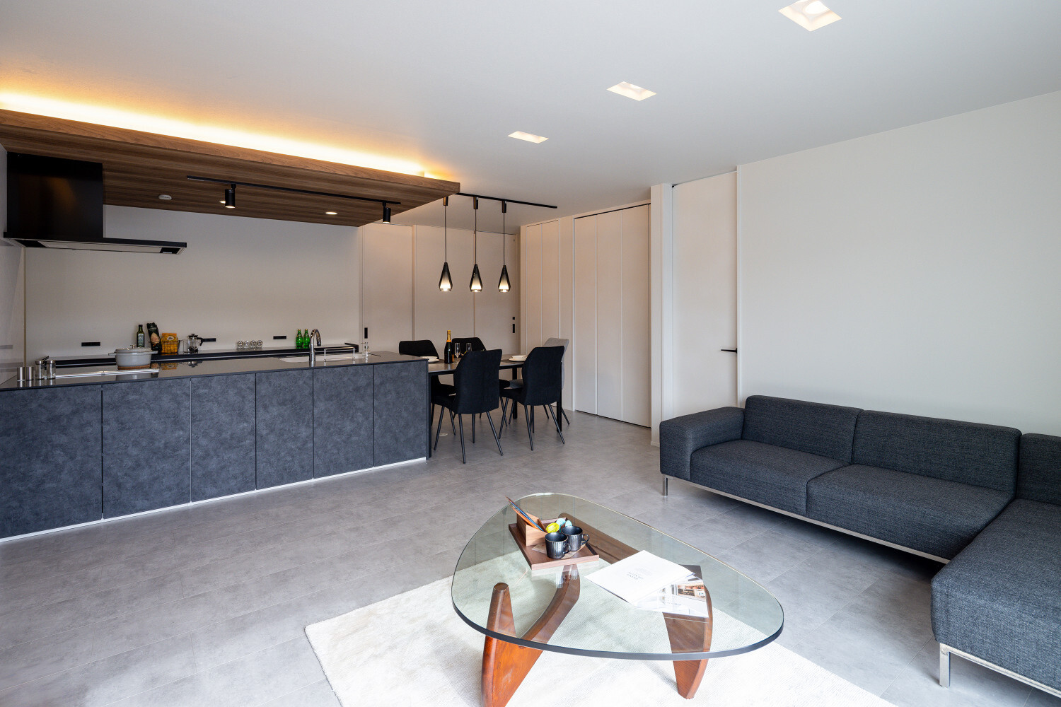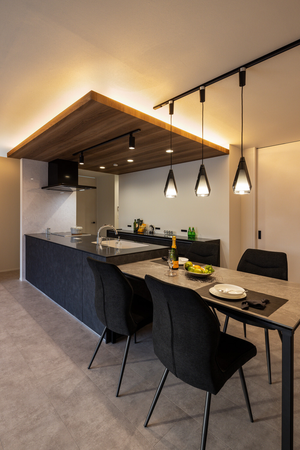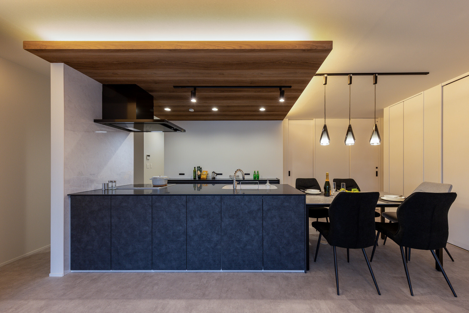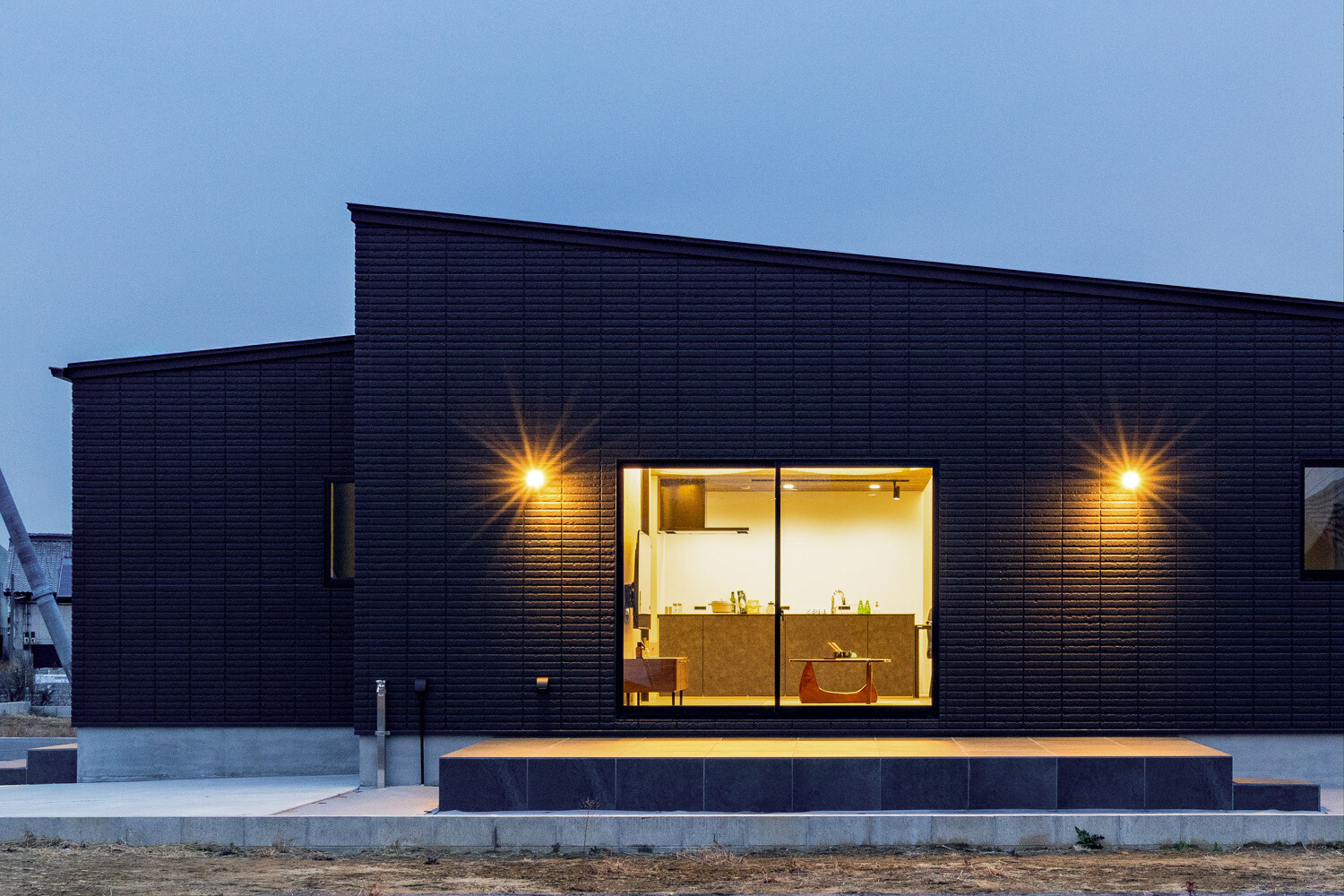 ホーム フォトギャラリー スタイル | Style すべて | ALL 光の設計が美しいグレイ×木目の32.5坪平屋 光の設計が美しいグレイ×木目の32.5坪平屋 スタイル | Style|すべて | ALL 開発団地角地、約70坪強の広い敷地に建つ子育て世代のお施主様のための32.5坪の平屋。 外壁は標準仕様のALCパワーボードを基本とし、アクセントにKMEWのSOLIDOを使用しております。画像のみを表示全 19 枚中 1 枚目を表示Next ≫ 玄関扉は幾分奥まったところに配し、降雨の折の帰宅時にも慌てて鍵を開ける必要がないように、また外から玄関扉が目立ち過ぎないように計画させて頂きました。画像のみを表示全 19 枚中 2 枚目を表示≪ Prev|Next ≫ 家の南側は大きなタイルテラスを設置させて頂きました。 タイルテラスは管理も楽ですし、劣化もそれほど心配しなくて良いのですが、夏は熱を持ってしまいますのでタイルテラス近くには立水栓の設置をされると良いと思います。画像のみを表示全 19 枚中 3 枚目を表示≪ Prev|Next ≫ 門柱はごくシンプルなモノとし、玄関タイルは外壁に合わせるような色味の600角となっております。 また、無機的な外壁に対し軒天の木目をアクセントとして配しました。画像のみを表示全 19 枚中 4 枚目を表示≪ Prev|Next ≫ リビング扉は薄くグレイのスモークが掛かった半透けの引き戸を天井一杯になるように計画。 スッキリ見え、また視覚的に天井を高く感じて頂けるようになっておるのではないでしょうか?画像のみを表示全 19 枚中 5 枚目を表示≪ Prev|Next ≫ 玄関の照明は天井の中心に配するのではなく、壁側に寄せまたそこにエコカラットを設置し、その凹凸に光が当ててその反射光で室内を照らすような形の計画となっております。画像のみを表示全 19 枚中 6 枚目を表示≪ Prev|Next ≫ 玄関ホールだけでなく、何にどう光を当てて、どのくらいの明るさにするかに依って、光源の位置も種類も数も色々考えていくと面白いと思います。 部屋の中心でひとつの光源で部屋を隅から隅まで明るくする照明でなくても良いように思います。画像のみを表示全 19 枚中 7 枚目を表示≪ Prev|Next ≫ リビング側からの扉の写真です。 良い感じで玄関ホール側の光が見えていると思います。 ちなみに玄関ホールのダウンライト3灯はセンサー付きとなっておりますので、ご家族の帰宅時照明がパッと点灯し、すぐにご帰宅確認ができるようになっております。画像のみを表示全 19 枚中 8 枚目を表示≪ Prev|Next ≫ 23帖を超える広いLDKです。 今回は床も含めグレイ×白という全体感でまとめていき、そこにキッチンの折下げ天井の木目でアクセントを作るという計画とさせて頂いております。画像のみを表示全 19 枚中 9 枚目を表示≪ Prev|Next ≫ LDKを全体で俯瞰しますと、必要なところに必要なだけ照明器具が設置されていることがご覧頂けると思います。 こちらですが、調光機能を持つ照明器具を設置させて頂いておりますので、必要な場合はもっと部屋を明るくも出来るようになっております。画像のみを表示全 19 枚中 10 枚目を表示≪ Prev|Next ≫ ご家族でゆっくりお過ごし頂くためのリビングという趣ですね。 キッチン位置からダイニングもソファの方向も向けるように計画されておりますので、キッチンに居ても孤独せずにいつもご家族とお過ごし頂けるように計画しました。画像のみを表示全 19 枚中 11 枚目を表示≪ Prev|Next ≫ リビングの掃き出し窓幅は約2700近くありますので大きいと言って良いと思います。 やはり陽の入る南側には大きな掃き出し窓があると良いなぁ、と個人的には考えております(隣地環境次第的な部分もありますが、三重県ではそんな極小地での建築事例は他県より少ないように感じます。)画像のみを表示全 19 枚中 12 枚目を表示≪ Prev|Next ≫ ダイニング側からリビング方向を眺めると、盛り沢山の天井要素を持つキッチン・ダイニング部分とスッキリしたリビング天井のコントラストが面白いですね。画像のみを表示全 19 枚中 13 枚目を表示≪ Prev|Next ≫ 白×グレイ×木目が綺麗に切り取られ表現されておりますことがご確認頂けるのではないでしょうか? また今回はキッチン上にライティングレールを設置させて頂きましたが、言うまでもなく、欲しいところに光をピタリと当てられるのもライティングレールの魅力ですね。画像のみを表示全 19 枚中 14 枚目を表示≪ Prev|Next ≫ 床のモルタルグレイとダイニングテーブルのグレイ、そして照明のガラス素材と黒が効いていますね。 同じ空間内では、色だけでなく素材のメリハリで強弱を付けて印象の操作するということも狙っていくと良いと思います。画像のみを表示全 19 枚中 15 枚目を表示≪ Prev|Next ≫ キッチンカップボードは吊戸無しをご選択頂きましたので目線が上下に振らず落ち着いた雰囲気になっております。 また天井の木目方向とキッチンの設置向きが同一ですので、横方向に目線が引っ張られより広がりをお感じ頂けるものかと存じます。画像のみを表示全 19 枚中