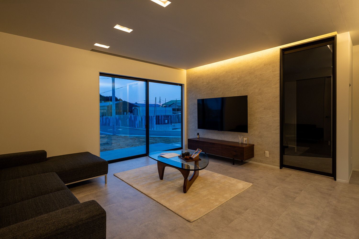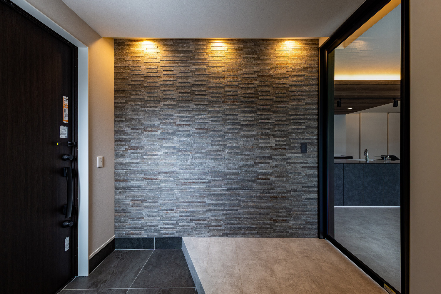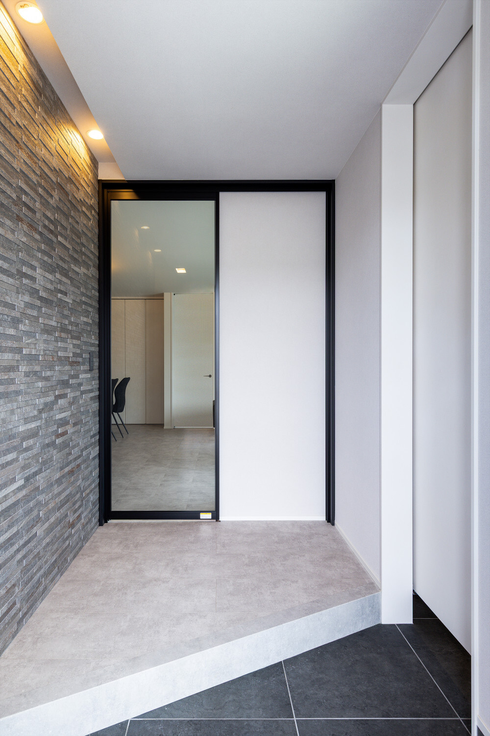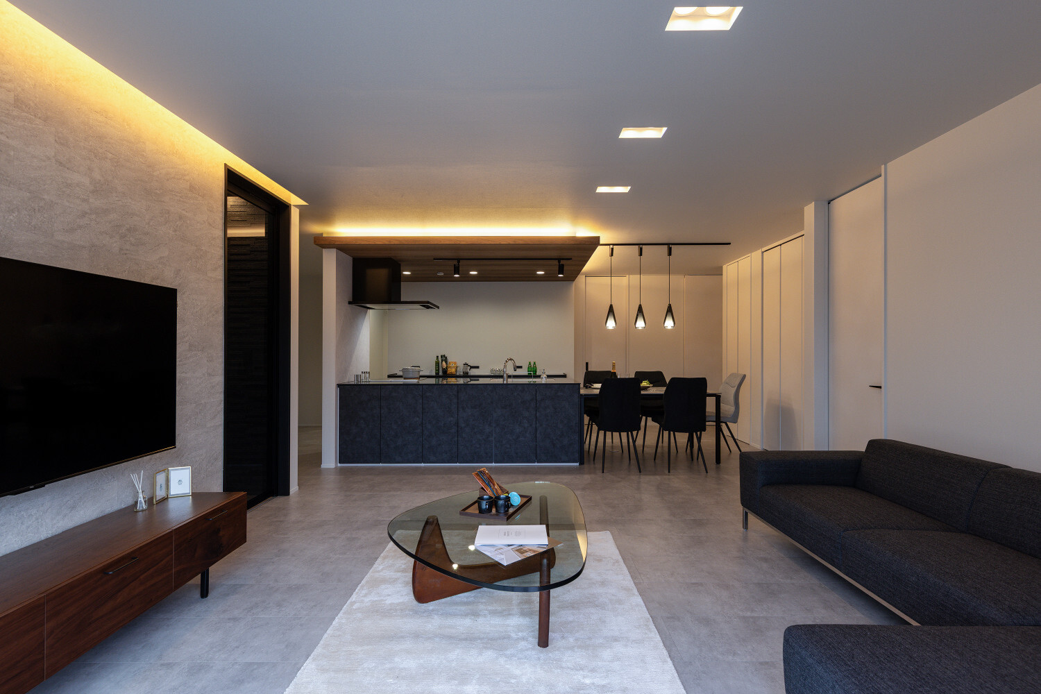 ホーム フォトギャラリー スタイル | Style すべて | ALL 光の設計が美しいグレイ×木目の32.5坪平屋 光の設計が美しいグレイ×木目の32.5坪平屋 スタイル | Style|すべて | ALL 開発団地角地、約70坪強の広い敷地に建つ子育て世代のお施主様のための32.5坪の平屋。 外壁は標準仕様のALCパワーボードを基本とし、アクセントにKMEWのSOLIDOを使用しております。画像のみを表示全 19 枚中 1 枚目を表示Next ≫ 玄関扉は幾分奥まったところに配し、降雨の折の帰宅時にも慌てて鍵を開ける必要がないように、また外から玄関扉が目立ち過ぎないように計画させて頂きました。画像のみを表示全 19 枚中 2 枚目を表示≪ Prev|Next ≫ 家の南側は大きなタイルテラスを設置させて頂きました。 タイルテラスは管理も楽ですし、劣化もそれほど心配しなくて良いのですが、夏は熱を持ってしまいますのでタイルテラス近くには立水栓の設置をされると良いと思います。画像のみを表示全 19 枚中 3 枚目を表示≪ Prev|Next ≫ 門柱はごくシンプルなモノとし、玄関タイルは外壁に合わせるような色味の600角となっております。 また、無機的な外壁に対し軒天の木目をアクセントとして配しました。画像のみを表示全 19 枚中 4 枚目を表示≪ Prev|Next ≫ リビング扉は薄くグレイのスモークが掛かった半透けの引き戸を天井一杯になるように計画。 スッキリ見え、また視覚的に天井を高く感じて頂けるようになっておるのではないでしょうか?画像のみを表示全 19 枚中 5 枚目を表示≪ Prev|Next ≫ 玄関の照明は天井の中心に配するのではなく、壁側に寄せまたそこにエコカラットを設置し、その凹凸に光が当ててその反射光で室内を照らすような形の計画となっております。画像のみを表示全 19 枚中 6 枚目を表示≪ Prev|Next ≫ 玄関ホールだけでなく、何にどう光を当てて、どのくらいの明るさにするかに依って、光源の位置も種類も数も色々考えていくと面白いと思います。 部屋の中心でひとつの光源で部屋を隅から隅まで明るくする照明でなくても良いように思います。画像のみを表示全 19 枚中 7 枚目を表示≪ Prev|Next ≫ リビング側からの扉の写真です。 良い感じで玄関ホール側の光が見えていると思います。 ちなみに玄関ホールのダウンライト3灯はセンサー付きとなっておりますので、ご家族の帰宅時照明がパッと点灯し、すぐにご帰宅確認ができるようになっております。画像のみを表示全 19 枚中 8 枚目を表示≪ Prev|Next ≫ 23帖を超える広いLDKです。 今回は床も含めグレイ×白という全体感でまとめていき、そこにキッチンの折下げ天井の木目でアクセントを作るという計画とさせて頂いております。画像のみを表示全 19 枚中 9 枚目を表示≪ Prev|Next ≫ LDKを全体で俯瞰しますと、必要なところに必要なだけ照明器具が設置されていることがご覧頂けると思います。 こちらですが、調光機能を持つ照明器具を設置させて頂いておりますので、必要な場合はもっと部屋を明るくも出来るようになっております。画像のみを表示全 19 枚中 10 枚目を表示≪ Prev|Next ≫ ご家族でゆっくりお過ごし頂くためのリビングという趣ですね。 キッチン位置からダイニングもソファの方向も向けるように計画されておりますので、キッチンに居ても孤独せずにいつもご家族とお過ごし頂けるように計画しました。画像のみを表示全 19 枚中 11 枚目を表示≪ Prev|Next ≫ リビングの掃き出し窓幅は約2700近くありますので大きいと言って良いと思います。 やはり陽の入る南側には大きな掃き出し窓があると良いなぁ、と個人的には考えております(隣地環境次第的な部分もありますが、三重県ではそんな極小地での建築事例は他県より少ないように感じます。)画像のみを表示全 19 枚中 12 枚目を表示≪ Prev|Next ≫ ダイニング側からリビング方向を眺めると、盛り沢山の天井要素を持つキッチン・ダイニング部分とスッキリしたリビング天井のコントラストが面白いですね。画像のみを表示全 19 枚中 13 枚目を表示≪ Prev|Next ≫ 白×グレイ×木目が綺麗に切り取られ表現されておりますことがご確認頂けるのではないでしょうか? また今回はキッチン上にライティングレールを設置させて頂きましたが、言うまでもなく、欲しいところに光をピタリと当てられるのもライティングレールの魅力ですね。画像のみを表示全 19 枚中 14 枚目を表示≪ Prev|Next ≫ 床のモルタルグレイとダイニングテーブルのグレイ、そして照明のガラス素材と黒が効いていますね。 同じ空間内では、色だけでなく素材のメリハリで強弱を付けて印象の操作するということも狙っていくと良いと思います。画像のみを表示全 19 枚中 15 枚目を表示≪ Prev|Next ≫ キッチンカップボードは吊戸無しをご選択頂きましたので目線が上下に振らず落ち着いた雰囲気になっております。 また天井の木目方向とキッチンの設置向きが同一ですので、横方向に目線が引っ張られより広がりをお感じ頂けるものかと存じます。画像のみを表示全 19 枚中