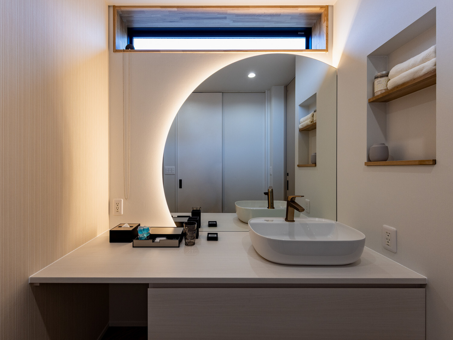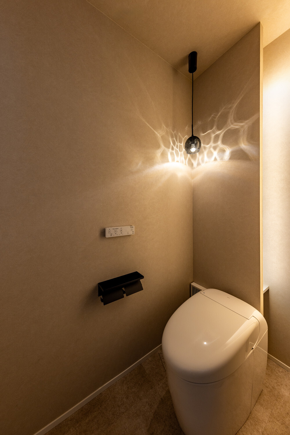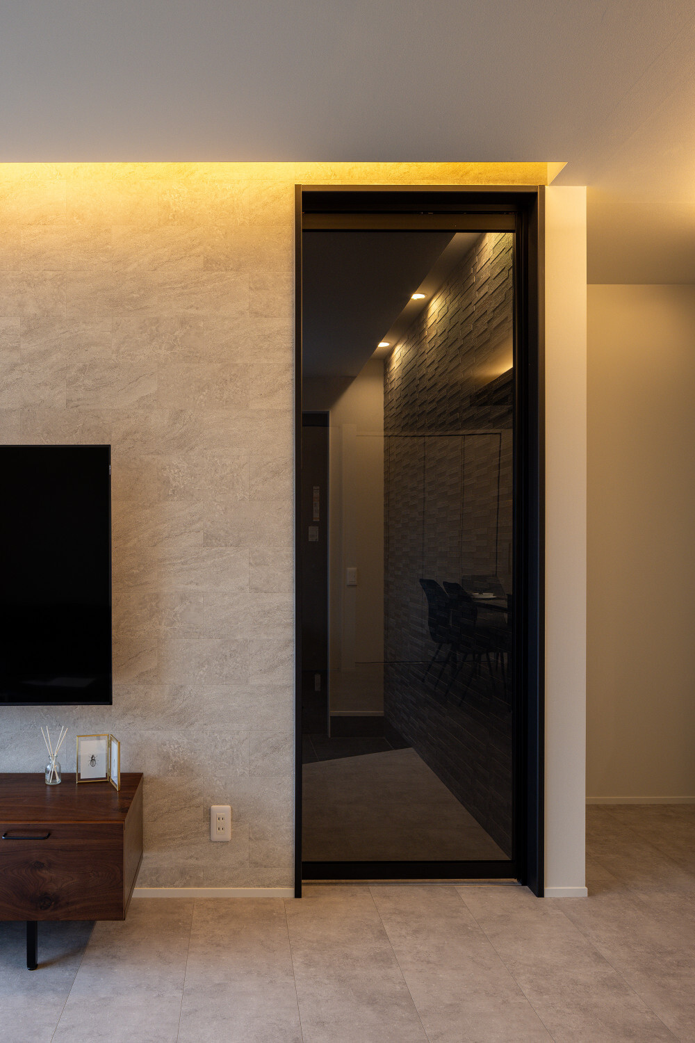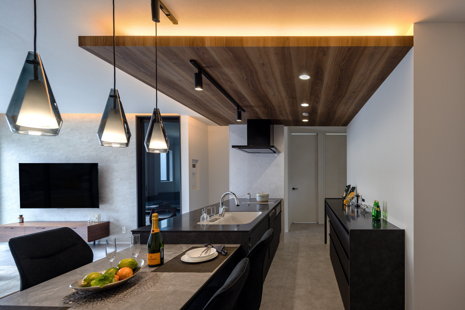 ホーム フォトギャラリー スタイル | Style すべて | ALL 光の設計が美しいグレイ×木目の32.5坪平屋 光の設計が美しいグレイ×木目の32.5坪平屋 スタイル | Style|すべて | ALL 開発団地角地、約70坪強の広い敷地に建つ子育て世代のお施主様のための32.5坪の平屋。 外壁は標準仕様のALCパワーボードを基本とし、アクセントにKMEWのSOLIDOを使用しております。画像のみを表示全 19 枚中 1 枚目を表示Next ≫ 玄関扉は幾分奥まったところに配し、降雨の折の帰宅時にも慌てて鍵を開ける必要がないように、また外から玄関扉が目立ち過ぎないように計画させて頂きました。画像のみを表示全 19 枚中 2 枚目を表示≪ Prev|Next ≫ 家の南側は大きなタイルテラスを設置させて頂きました。 タイルテラスは管理も楽ですし、劣化もそれほど心配しなくて良いのですが、夏は熱を持ってしまいますのでタイルテラス近くには立水栓の設置をされると良いと思います。画像のみを表示全 19 枚中 3 枚目を表示≪ Prev|Next ≫ 門柱はごくシンプルなモノとし、玄関タイルは外壁に合わせるような色味の600角となっております。 また、無機的な外壁に対し軒天の木目をアクセントとして配しました。画像のみを表示全 19 枚中 4 枚目を表示≪ Prev|Next ≫ リビング扉は薄くグレイのスモークが掛かった半透けの引き戸を天井一杯になるように計画。 スッキリ見え、また視覚的に天井を高く感じて頂けるようになっておるのではないでしょうか?画像のみを表示全 19 枚中 5 枚目を表示≪ Prev|Next ≫ 玄関の照明は天井の中心に配するのではなく、壁側に寄せまたそこにエコカラットを設置し、その凹凸に光が当ててその反射光で室内を照らすような形の計画となっております。画像のみを表示全 19 枚中 6 枚目を表示≪ Prev|Next ≫ 玄関ホールだけでなく、何にどう光を当てて、どのくらいの明るさにするかに依って、光源の位置も種類も数も色々考えていくと面白いと思います。 部屋の中心でひとつの光源で部屋を隅から隅まで明るくする照明でなくても良いように思います。画像のみを表示全 19 枚中 7 枚目を表示≪ Prev|Next ≫ リビング側からの扉の写真です。 良い感じで玄関ホール側の光が見えていると思います。 ちなみに玄関ホールのダウンライト3灯はセンサー付きとなっておりますので、ご家族の帰宅時照明がパッと点灯し、すぐにご帰宅確認ができるようになっております。画像のみを表示全 19 枚中 8 枚目を表示≪ Prev|Next ≫ 23帖を超える広いLDKです。 今回は床も含めグレイ×白という全体感でまとめていき、そこにキッチンの折下げ天井の木目でアクセントを作るという計画とさせて頂いております。画像のみを表示全 19 枚中 9 枚目を表示≪ Prev|Next ≫ LDKを全体で俯瞰しますと、必要なところに必要なだけ照明器具が設置されていることがご覧頂けると思います。 こちらですが、調光機能を持つ照明器具を設置させて頂いておりますので、必要な場合はもっと部屋を明るくも出来るようになっております。画像のみを表示全 19 枚中 10 枚目を表示≪ Prev|Next ≫ ご家族でゆっくりお過ごし頂くためのリビングという趣ですね。 キッチン位置からダイニングもソファの方向も向けるように計画されておりますので、キッチンに居ても孤独せずにいつもご家族とお過ごし頂けるように計画しました。画像のみを表示全 19 枚中 11 枚目を表示≪ Prev|Next ≫ リビングの掃き出し窓幅は約2700近くありますので大きいと言って良いと思います。 やはり陽の入る南側には大きな掃き出し窓があると良いなぁ、と個人的には考えております(隣地環境次第的な部分もありますが、三重県ではそんな極小地での建築事例は他県より少ないように感じます。)画像のみを表示全 19 枚中 12 枚目を表示≪ Prev|Next ≫ ダイニング側からリビング方向を眺めると、盛り沢山の天井要素を持つキッチン・ダイニング部分とスッキリしたリビング天井のコントラストが面白いですね。画像のみを表示全 19 枚中 13 枚目を表示≪ Prev|Next ≫ 白×グレイ×木目が綺麗に切り取られ表現されておりますことがご確認頂けるのではないでしょうか? また今回はキッチン上にライティングレールを設置させて頂きましたが、言うまでもなく、欲しいところに光をピタリと当てられるのもライティングレールの魅力ですね。画像のみを表示全 19 枚中 14 枚目を表示≪ Prev|Next ≫ 床のモルタルグレイとダイニングテーブルのグレイ、そして照明のガラス素材と黒が効いていますね。 同じ空間内では、色だけでなく素材のメリハリで強弱を付けて印象の操作するということも狙っていくと良いと思います。画像のみを表示全 19 枚中 15 枚目を表示≪ Prev|Next ≫ キッチンカップボードは吊戸無しをご選択頂きましたので目線が上下に振らず落ち着いた雰囲気になっております。 また天井の木目方向とキッチンの設置向きが同一ですので、横方向に目線が引っ張られより広がりをお感じ頂けるものかと存じます。画像のみを表示全 19 枚中
