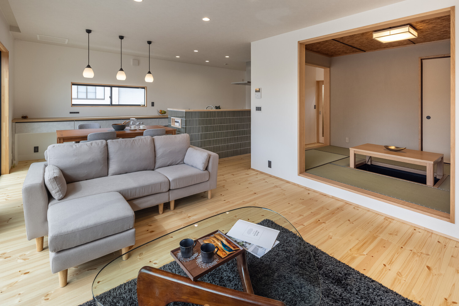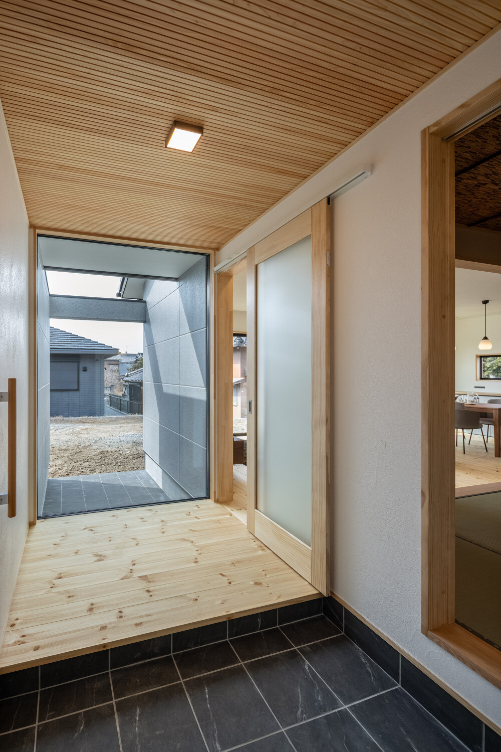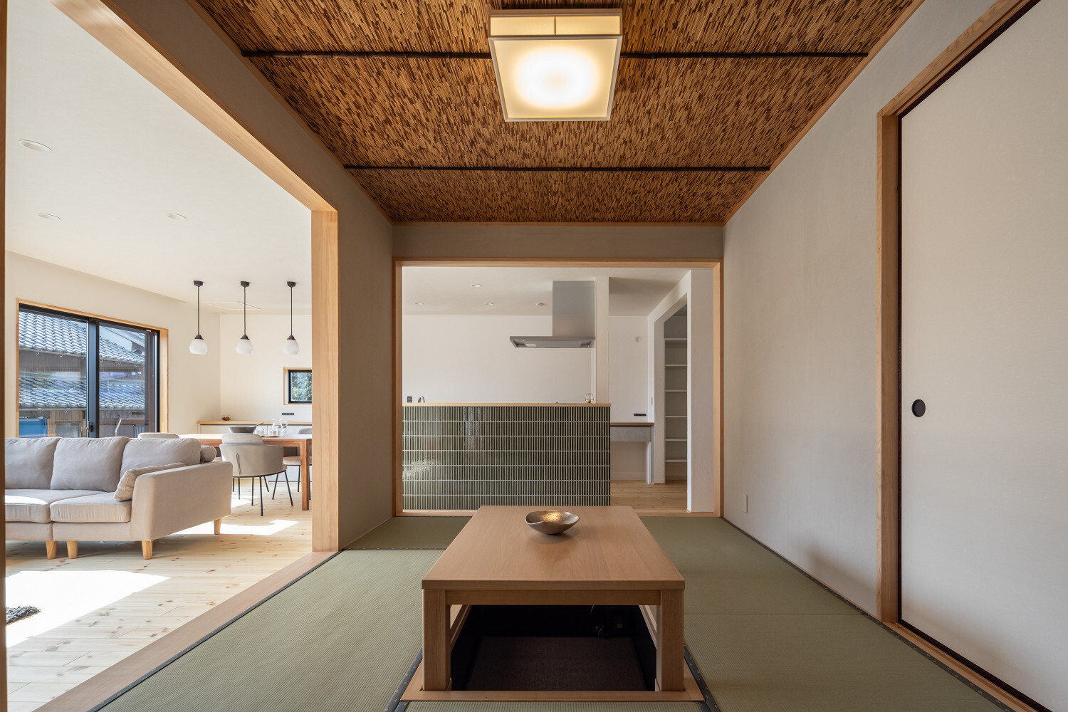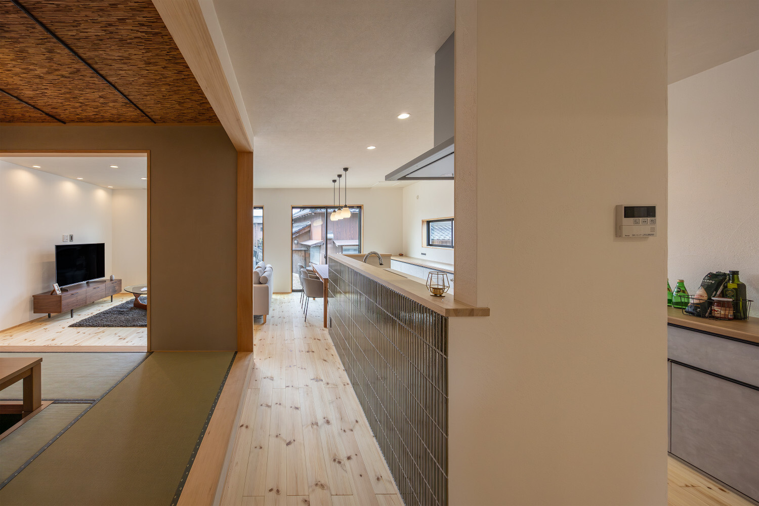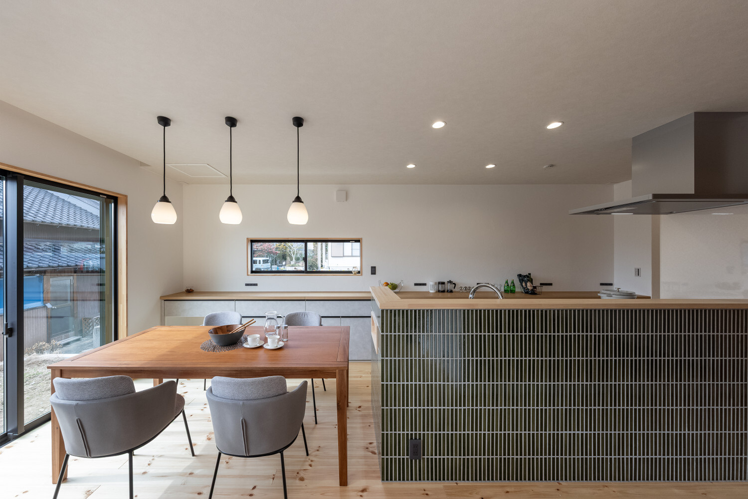 ホーム フォトギャラリー スタイル | Style 和モダン | Japanese Modern ジャパンディから辿り着いた、旅館ライクな住まい ジャパンディから辿り着いた、旅館ライクな住まい スタイル | Style|和モダン | Japanese Modern 最初のお話は『ジャパンディ』な雰囲気がご夫婦でお好きということで計画がスタートしたのですが、途中から『旅館ライク』という言葉がキーワードになって(ホテルライクの和式みたいな理解です)、色々なモノが決めていかれた本宅。 仕上げ材を選択するときの加減が非常に繊細で、毎度アレコレ議論しながら作り込んでいったという感じでした。 ライブ感のある楽しい打合せが続いたという記憶です。 玄関扉は引き戸とし、大きな軒は庭側へも抜けられるように計画されております。 またタイルや照明器具で『和』をニュアンスとして感じられるものを選択していきました。画像のみを表示全 14 枚中 1 枚目を表示Next ≫ 建物の外観はオーソドックスな切り妻タイプとし、玄関正面に大きなFIX窓が嵌められていますので、玄関ホールでの抜け感・広がりを感じてもらえるように計画させて頂いております。画像のみを表示全 14 枚中 2 枚目を表示≪ Prev|Next ≫ 今回の床材はパインとし、全体的に明るめの雰囲気で取りまとめをさせて頂いております。 こちらの玄関ホールの天井はヒノキ板となっており、現場に行くととても良い香りで迎えてくれます。画像のみを表示全 14 枚中 3 枚目を表示≪ Prev|Next ≫ 玄関にはふたつの出入り口があり、場合に拠りましては和室に直接入ることも出来ますので、来られたお客様次第で使い分けをしていくと面白いね、ということでリビングサイドへふたつの出入り口を持つ家となっております。画像のみを表示全 14 枚中 4 枚目を表示≪ Prev|Next ≫ LDKはダイニングとリビングを南側に配し、アイランドキッチンと和室がその北側に来るというシンプルな考え方で取りまとめをさせて頂いております。 間取りの考え方をシンプルと書きましたが、光の入る方向は不変ですし、僕たちの住む地域ならではの風向もありますので、自然や敷地条件にケンカしない間取りは大切だと考えております。画像のみを表示全 14 枚中 5 枚目を表示≪ Prev|Next ≫ 最近少なって来ているように感じますが和室には階段1段分程度の段差を設置、また掘りコタツもありますので、冬が楽しみですね!画像のみを表示全 14 枚中 6 枚目を表示≪ Prev|Next ≫ リビングスペースの照明計画はTV上と、リビングに系統を分けてご提案。 こちらのダウンライトですが調光機能を持っておりますので、お子様たちが先に就寝した後の大人時間に照明を落としてTVの視聴をして頂きやすいようにと計画させて頂いております。画像のみを表示全 14 枚中 7 枚目を表示≪ Prev|Next ≫ キッチン腰壁はタイルを施工させて頂いております。 こちらも『和』を強調することなく、それでも日本人であれば『和』を何となく感じてしまう雰囲気を持つものをご選択頂いております。 またキッチン腰壁の笠木も何となく『和』の雰囲気を持つものを施工させて頂いておりますので、何となくフワッと『和』という感じの取りまとめをさせて頂いております。画像のみを表示全 14 枚中 8 枚目を表示≪ Prev|Next ≫ 今回面白い部分のひとつであります、とっても長いカップボードです。 多くの場合はキッチン背面だけにカップボードを設置と言うことが多いのですが、今回はキッチン背面を大きく越境し、ダイニング側までカップボードを施工させて頂きましたので、収納力もたっぷり確保です。画像のみを表示全 14 枚中 9 枚目を表示≪ Prev|Next ≫ このリビングと一体化した通路部分を通って2階に上がっていく階段に行けますで、お子様の顔をキッチンに居る家族が見れるという構成にさせて頂いておりますこと、またアイランドキッチンの非効率な空間利用を廊下的な意味を持たせることで積極的に活用できるように計画させて頂いております。画像のみを表示全 14 枚中 10 枚目を表示≪ Prev|Next ≫ 2方向に大きく開かれた和室。 こちら当初は2方向に建具設置前提でご提案させて頂いておりましたが、上棟後の現場確認時に解放感を優先したいね、と言う話になり建具無しとさせて頂いております。画像のみを表示全 14 枚中 11 枚目を表示≪ Prev|Next ≫ トイレの中も『旅館ライク』を貫いて吟味された素材、仕上げ感を持つ建材で取りまとめをさせて頂きました。画像のみを表示全 14 枚中 12 枚目を表示≪ Prev|Next ≫ こちらの製作洗面化粧台はアイカ工業のモノをベースにしながら、あれこれ煮詰めていきました(ヒノキ柄の面材です)。 またキッチン腰壁でも使用しておりますタイルの色違いを洗面化粧台奥側壁に設置し、家全体の統一感のようなものを作っていきました。画像のみを表示全 14 枚中 13 枚目を表示≪ Prev|Next ≫ 寝室の壁はフロアと同じパインを窓下まで腰板として設置し、お施主様から『どうしても寝室のライティングはそうしたい!』とい