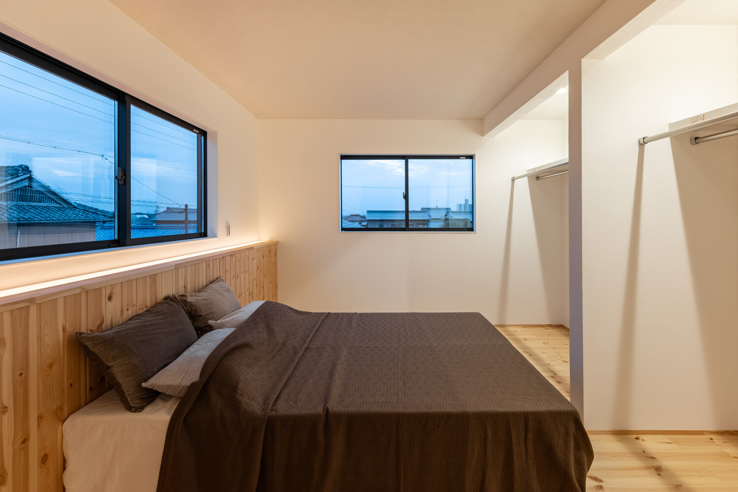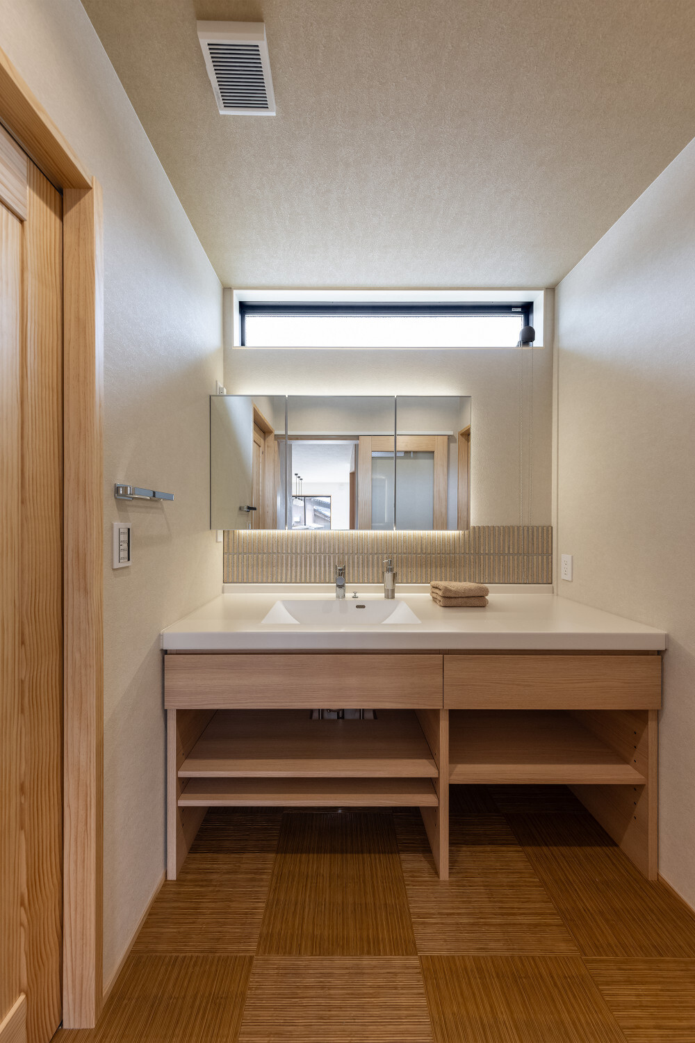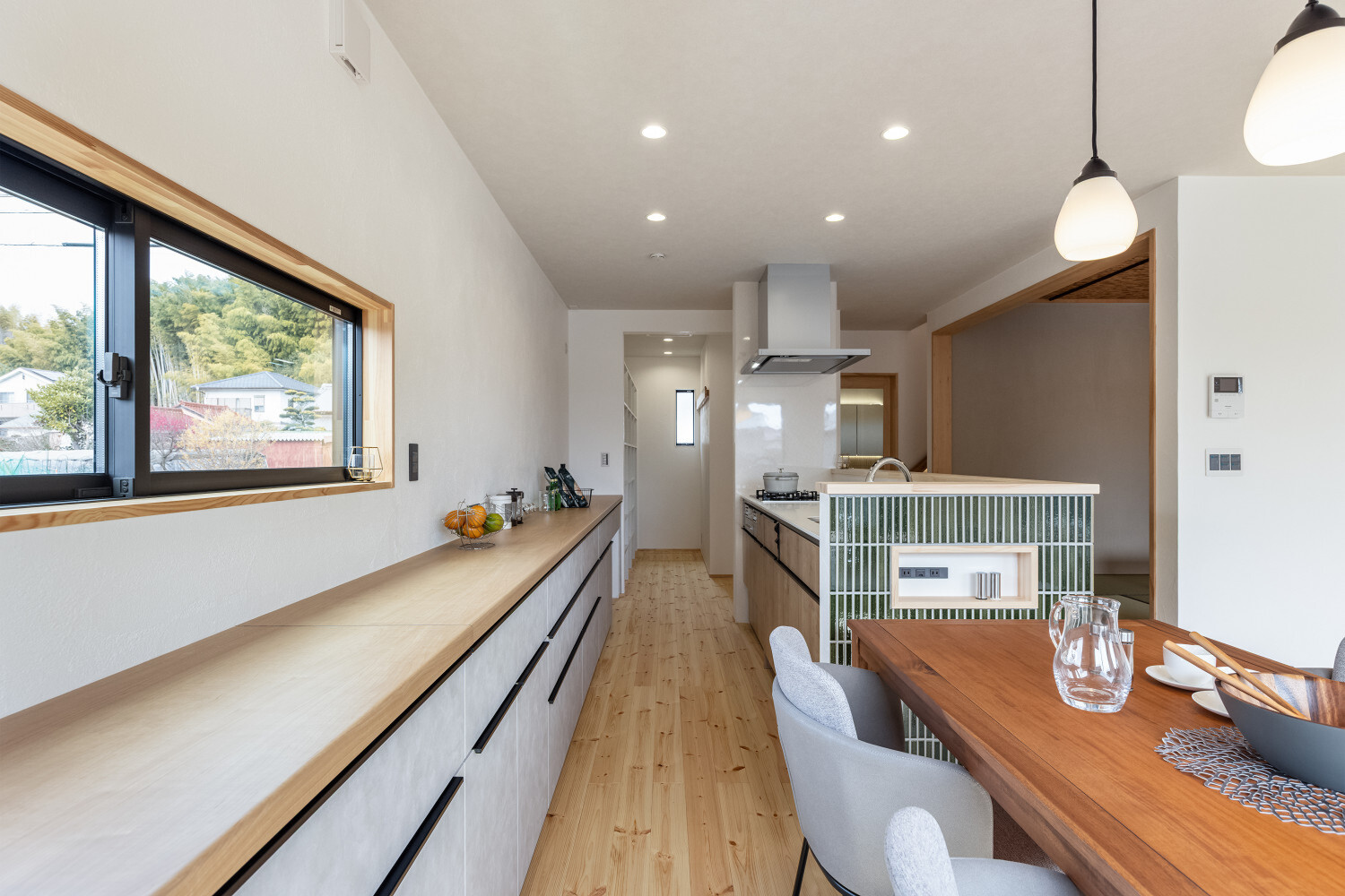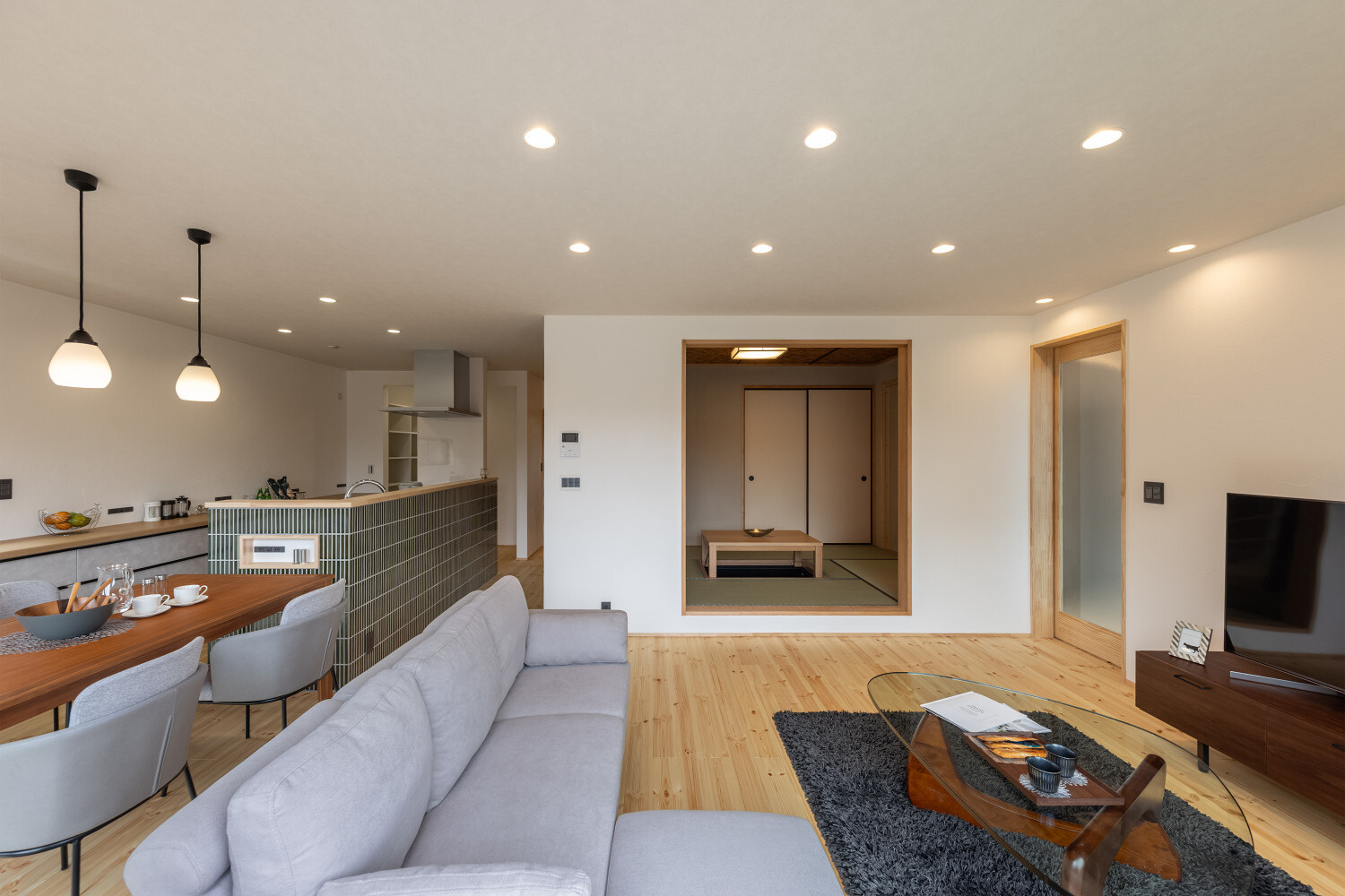 ホーム フォトギャラリー スタイル | Style 和モダン | Japanese Modern ジャパンディから辿り着いた、旅館ライクな住まい ジャパンディから辿り着いた、旅館ライクな住まい スタイル | Style|和モダン | Japanese Modern 最初のお話は『ジャパンディ』な雰囲気がご夫婦でお好きということで計画がスタートしたのですが、途中から『旅館ライク』という言葉がキーワードになって(ホテルライクの和式みたいな理解です)、色々なモノが決めていかれた本宅。 仕上げ材を選択するときの加減が非常に繊細で、毎度アレコレ議論しながら作り込んでいったという感じでした。 ライブ感のある楽しい打合せが続いたという記憶です。 玄関扉は引き戸とし、大きな軒は庭側へも抜けられるように計画されております。 またタイルや照明器具で『和』をニュアンスとして感じられるものを選択していきました。画像のみを表示全 14 枚中 1 枚目を表示Next ≫ 建物の外観はオーソドックスな切り妻タイプとし、玄関正面に大きなFIX窓が嵌められていますので、玄関ホールでの抜け感・広がりを感じてもらえるように計画させて頂いております。画像のみを表示全 14 枚中 2 枚目を表示≪ Prev|Next ≫ 今回の床材はパインとし、全体的に明るめの雰囲気で取りまとめをさせて頂いております。 こちらの玄関ホールの天井はヒノキ板となっており、現場に行くととても良い香りで迎えてくれます。画像のみを表示全 14 枚中 3 枚目を表示≪ Prev|Next ≫ 玄関にはふたつの出入り口があり、場合に拠りましては和室に直接入ることも出来ますので、来られたお客様次第で使い分けをしていくと面白いね、ということでリビングサイドへふたつの出入り口を持つ家となっております。画像のみを表示全 14 枚中 4 枚目を表示≪ Prev|Next ≫ LDKはダイニングとリビングを南側に配し、アイランドキッチンと和室がその北側に来るというシンプルな考え方で取りまとめをさせて頂いております。 間取りの考え方をシンプルと書きましたが、光の入る方向は不変ですし、僕たちの住む地域ならではの風向もありますので、自然や敷地条件にケンカしない間取りは大切だと考えております。画像のみを表示全 14 枚中 5 枚目を表示≪ Prev|Next ≫ 最近少なって来ているように感じますが和室には階段1段分程度の段差を設置、また掘りコタツもありますので、冬が楽しみですね!画像のみを表示全 14 枚中 6 枚目を表示≪ Prev|Next ≫ リビングスペースの照明計画はTV上と、リビングに系統を分けてご提案。 こちらのダウンライトですが調光機能を持っておりますので、お子様たちが先に就寝した後の大人時間に照明を落としてTVの視聴をして頂きやすいようにと計画させて頂いております。画像のみを表示全 14 枚中 7 枚目を表示≪ Prev|Next ≫ キッチン腰壁はタイルを施工させて頂いております。 こちらも『和』を強調することなく、それでも日本人であれば『和』を何となく感じてしまう雰囲気を持つものをご選択頂いております。 またキッチン腰壁の笠木も何となく『和』の雰囲気を持つものを施工させて頂いておりますので、何となくフワッと『和』という感じの取りまとめをさせて頂いております。画像のみを表示全 14 枚中 8 枚目を表示≪ Prev|Next ≫ 今回面白い部分のひとつであります、とっても長いカップボードです。 多くの場合はキッチン背面だけにカップボードを設置と言うことが多いのですが、今回はキッチン背面を大きく越境し、ダイニング側までカップボードを施工させて頂きましたので、収納力もたっぷり確保です。画像のみを表示全 14 枚中 9 枚目を表示≪ Prev|Next ≫ このリビングと一体化した通路部分を通って2階に上がっていく階段に行けますで、お子様の顔をキッチンに居る家族が見れるという構成にさせて頂いておりますこと、またアイランドキッチンの非効率な空間利用を廊下的な意味を持たせることで積極的に活用できるように計画させて頂いております。画像のみを表示全 14 枚中 10 枚目を表示≪ Prev|Next ≫ 2方向に大きく開かれた和室。 こちら当初は2方向に建具設置前提でご提案させて頂いておりましたが、上棟後の現場確認時に解放感を優先したいね、と言う話になり建具無しとさせて頂いております。画像のみを表示全 14 枚中 11 枚目を表示≪ Prev|Next ≫ トイレの中も『旅館ライク』を貫いて吟味された素材、仕上げ感を持つ建材で取りまとめをさせて頂きました。画像のみを表示全 14 枚中 12 枚目を表示≪ Prev|Next ≫ こちらの製作洗面化粧台はアイカ工業のモノをベースにしながら、あれこれ煮詰めていきました(ヒノキ柄の面材です)。 またキッチン腰壁でも使用しておりますタイルの色違いを洗面化粧台奥側壁に設置し、家全体の統一感のようなものを作っていきました。画像のみを表示全 14 枚中 13 枚目を表示≪ Prev|Next ≫ 寝室の壁はフロアと同じパインを窓下まで腰板として設置し、お施主様から『どうしても寝室のライティングはそうしたい!』とい