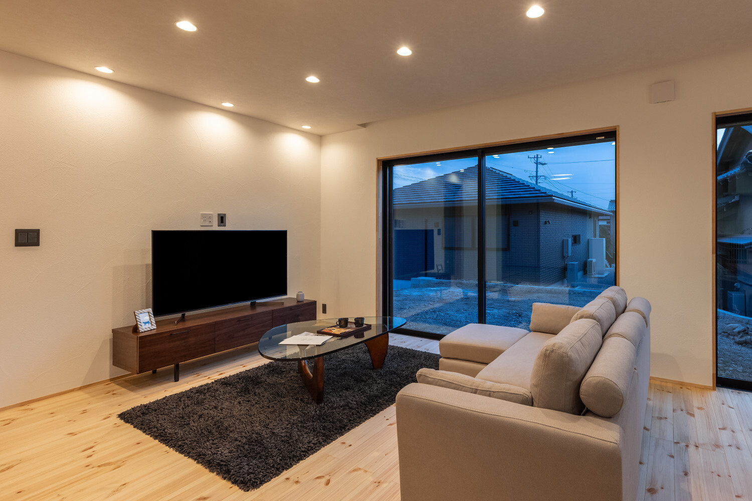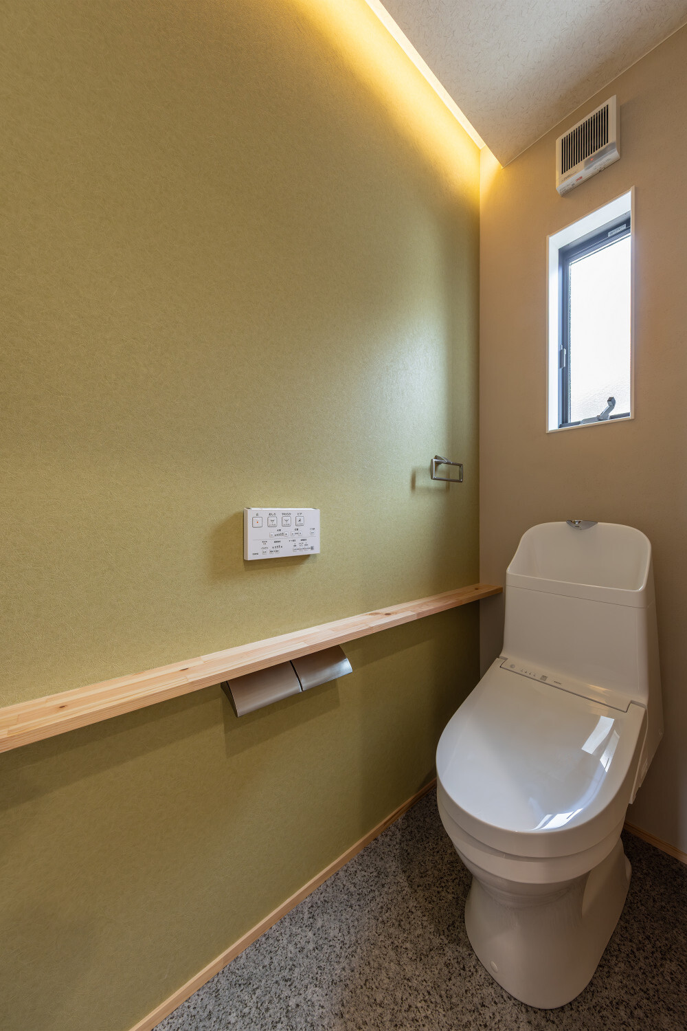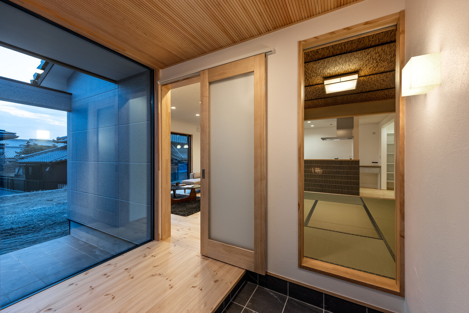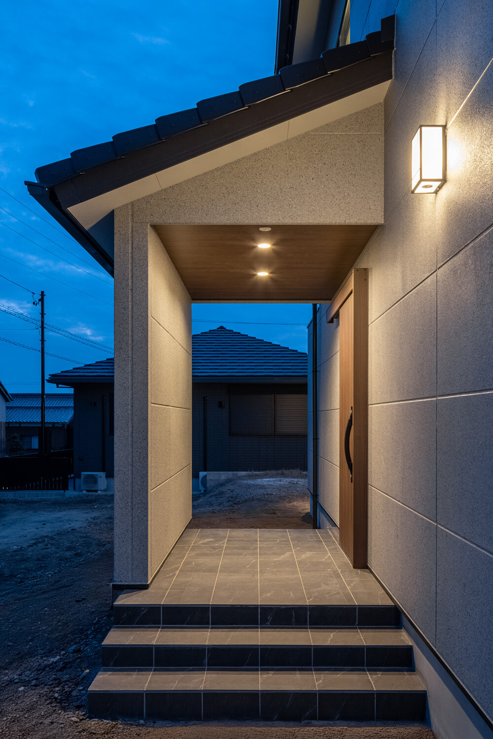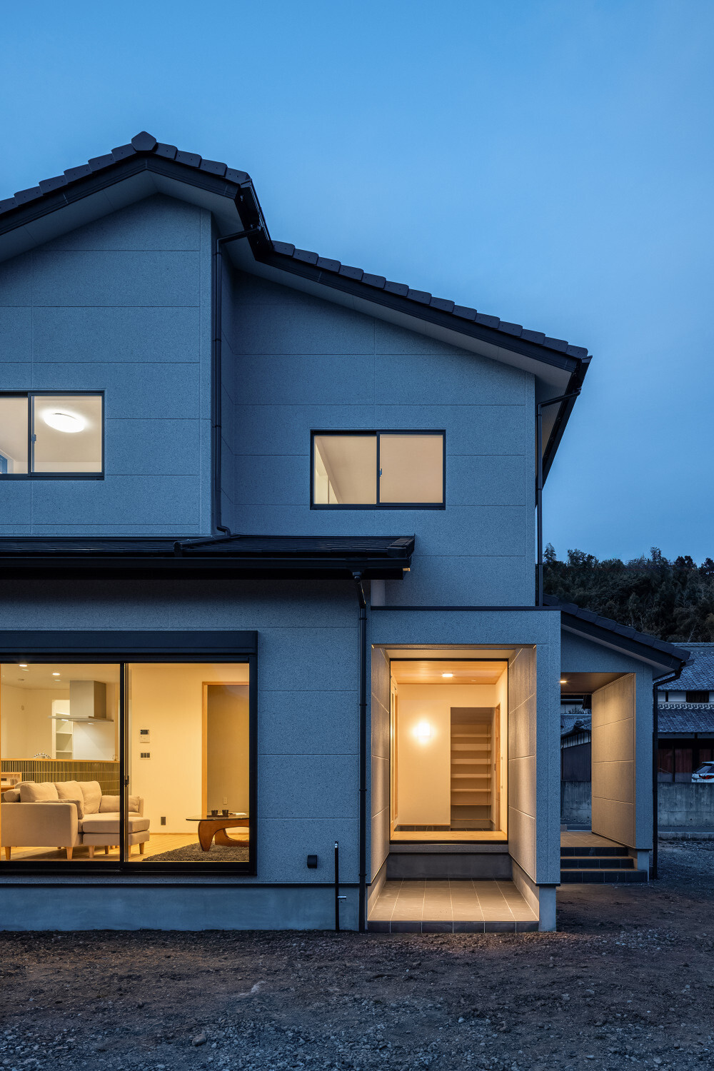 ホーム フォトギャラリー スタイル | Style 和モダン | Japanese Modern ジャパンディから辿り着いた、旅館ライクな住まい ジャパンディから辿り着いた、旅館ライクな住まい スタイル | Style|和モダン | Japanese Modern 最初のお話は『ジャパンディ』な雰囲気がご夫婦でお好きということで計画がスタートしたのですが、途中から『旅館ライク』という言葉がキーワードになって(ホテルライクの和式みたいな理解です)、色々なモノが決めていかれた本宅。 仕上げ材を選択するときの加減が非常に繊細で、毎度アレコレ議論しながら作り込んでいったという感じでした。 ライブ感のある楽しい打合せが続いたという記憶です。 玄関扉は引き戸とし、大きな軒は庭側へも抜けられるように計画されております。 またタイルや照明器具で『和』をニュアンスとして感じられるものを選択していきました。画像のみを表示全 14 枚中 1 枚目を表示Next ≫ 建物の外観はオーソドックスな切り妻タイプとし、玄関正面に大きなFIX窓が嵌められていますので、玄関ホールでの抜け感・広がりを感じてもらえるように計画させて頂いております。画像のみを表示全 14 枚中 2 枚目を表示≪ Prev|Next ≫ 今回の床材はパインとし、全体的に明るめの雰囲気で取りまとめをさせて頂いております。 こちらの玄関ホールの天井はヒノキ板となっており、現場に行くととても良い香りで迎えてくれます。画像のみを表示全 14 枚中 3 枚目を表示≪ Prev|Next ≫ 玄関にはふたつの出入り口があり、場合に拠りましては和室に直接入ることも出来ますので、来られたお客様次第で使い分けをしていくと面白いね、ということでリビングサイドへふたつの出入り口を持つ家となっております。画像のみを表示全 14 枚中 4 枚目を表示≪ Prev|Next ≫ LDKはダイニングとリビングを南側に配し、アイランドキッチンと和室がその北側に来るというシンプルな考え方で取りまとめをさせて頂いております。 間取りの考え方をシンプルと書きましたが、光の入る方向は不変ですし、僕たちの住む地域ならではの風向もありますので、自然や敷地条件にケンカしない間取りは大切だと考えております。画像のみを表示全 14 枚中 5 枚目を表示≪ Prev|Next ≫ 最近少なって来ているように感じますが和室には階段1段分程度の段差を設置、また掘りコタツもありますので、冬が楽しみですね!画像のみを表示全 14 枚中 6 枚目を表示≪ Prev|Next ≫ リビングスペースの照明計画はTV上と、リビングに系統を分けてご提案。 こちらのダウンライトですが調光機能を持っておりますので、お子様たちが先に就寝した後の大人時間に照明を落としてTVの視聴をして頂きやすいようにと計画させて頂いております。画像のみを表示全 14 枚中 7 枚目を表示≪ Prev|Next ≫ キッチン腰壁はタイルを施工させて頂いております。 こちらも『和』を強調することなく、それでも日本人であれば『和』を何となく感じてしまう雰囲気を持つものをご選択頂いております。 またキッチン腰壁の笠木も何となく『和』の雰囲気を持つものを施工させて頂いておりますので、何となくフワッと『和』という感じの取りまとめをさせて頂いております。画像のみを表示全 14 枚中 8 枚目を表示≪ Prev|Next ≫ 今回面白い部分のひとつであります、とっても長いカップボードです。 多くの場合はキッチン背面だけにカップボードを設置と言うことが多いのですが、今回はキッチン背面を大きく越境し、ダイニング側までカップボードを施工させて頂きましたので、収納力もたっぷり確保です。画像のみを表示全 14 枚中 9 枚目を表示≪ Prev|Next ≫ このリビングと一体化した通路部分を通って2階に上がっていく階段に行けますで、お子様の顔をキッチンに居る家族が見れるという構成にさせて頂いておりますこと、またアイランドキッチンの非効率な空間利用を廊下的な意味を持たせることで積極的に活用できるように計画させて頂いております。画像のみを表示全 14 枚中 10 枚目を表示≪ Prev|Next ≫ 2方向に大きく開かれた和室。 こちら当初は2方向に建具設置前提でご提案させて頂いておりましたが、上棟後の現場確認時に解放感を優先したいね、と言う話になり建具無しとさせて頂いております。画像のみを表示全 14 枚中 11 枚目を表示≪ Prev|Next ≫ トイレの中も『旅館ライク』を貫いて吟味された素材、仕上げ感を持つ建材で取りまとめをさせて頂きました。画像のみを表示全 14 枚中 12 枚目を表示≪ Prev|Next ≫ こちらの製作洗面化粧台はアイカ工業のモノをベースにしながら、あれこれ煮詰めていきました(ヒノキ柄の面材です)。 またキッチン腰壁でも使用しておりますタイルの色違いを洗面化粧台奥側壁に設置し、家全体の統一感のようなものを作っていきました。画像のみを表示全 14 枚中 13 枚目を表示≪ Prev|Next ≫ 寝室の壁はフロアと同じパインを窓下まで腰板として設置し、お施主様から『どうしても寝室のライティングはそうしたい!』とい